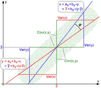 Cette corrélation est très souvent réduite à la corrélation linéaire entre variables quantitatives, c’est-à-dire l’ajustement d’une variable par rapport à l’autre par une relation affine obtenue par régression linéaire. Pour cela, on calcule un coefficient de corrélation linéaire[1], quotient de leur covariance par le produit de leurs écarts types. Son signe indique si des valeurs plus hautes de l’une correspondent « en moyenne » à des valeurs plus hautes ou plus basses pour l’autre. La valeur absolue du coefficient, toujours comprise entre 0 et 1, ne mesure pas l’intensité de la liaison mais la prépondérance de la relation affine sur les variations internes des variables. Un coefficient nul n’implique pas l'indépendance, car d’autres types de corrélation sont possibles.