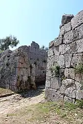L’enceinte de la ville épouse les contours du sommet de la colline. Sa forme générale est donc totalement irrégulière, affectant la forme d’un losange de 1,5 km de périmètre. Son tracé est scandé par une série de tours carrées, qui se succèdent à intervalles réguliers sur les côtés sud et ouest mais sont quasiment absentes à l’est et au nord (probablement un effet de source, l'absence de tours retrouvées en fouille ne prouvant pas nécessairement qu'elles n'ont pas existé). Trois portes ont été reconnues, l’une au sud en direction du port, et les deux autres, au nord-est et au nord-ouest, permettant de rejoindre la Via Aurelia. Au sein de cette muraille a été aménagé un réseau viaire orthogonal, formé de deux séries de rues parallèles, qui se coupent à angle droit. Ces rues définissent ainsi une série d’îlots rectangulaires dans lesquelles se répartissent les maisons et les édifices publics. L’axe de la cadastration des terres prolonge celui des rues de la ville, ce qui montre que les mêmes principes ont été appliqués dans l’aménagement de l’espace urbain (répartition de l’habitat des colons) et dans celui de l’espace rural (attribution de leurs lots de terre). Il faut toutefois nuancer la régularité de ce schéma en signalant que, dans la trame urbaine, l’intervalle entre les rues n’est pas uniforme. On aboutit ainsi à des îlots de taille très variable. Au nord de la rue O, on relève une constante dans la largeur des îlots (environ 35 mètres), mais pas dans leur longueur. En revanche, les quartiers sud présentent des îlots beaucoup plus vastes.