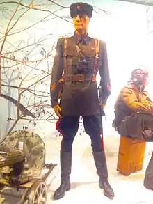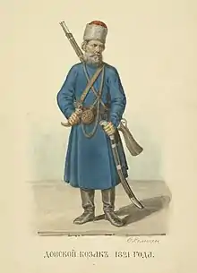 L’uniforme est bleu galonné de rouge, avec la coiffe de fourrure typique des cosaques.