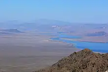 Vue légèrement à l'est du vrai Nord. La partie de la vallée à gauche se trouve au Nevada. La vue est prise à partir du pic Spirit Mountain (en), au sein des Newberry Mountains (en), avec le lac Mohave en arrière-plan.
