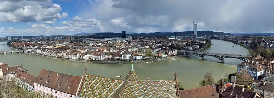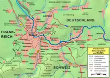 Le coude du Rhin se trouve dans sa totalité sur le territoire de la Suisse, à Bâle, le centre du RegioTriRhenal, et ses quartiers Riehen et Bettingen. Plus au nord, se trouvent les localités allemandes de Lörrach et de Weil am Rhein ainsi que les villes françaises de Huningue et Saint-Louis (Haut-Rhin)[2]. Puis le Rhin continue son cours dans le fossé rhénan.
