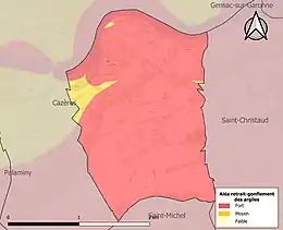 La commune est vulnérable au risque de mouvements de terrains constitué principalement du retrait-gonflement des sols argileux[32]. Cet aléa est susceptible d'engendrer des dommages importants aux bâtiments en cas d’alternance de périodes de sécheresse et de pluie. La totalité de la commune est en aléa moyen ou fort (88,8 % au niveau départemental et 48,5 % au niveau national). Sur les 234 bâtiments dénombrés sur la commune en 2019, 234 sont en aléa moyen ou fort, soit 100 %, à comparer aux 98 % au niveau départemental et 54 % au niveau national. Une cartographie de l'exposition du territoire national au retrait gonflement des sols argileux est disponible sur le site du BRGM[33],[Carte 3].