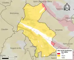 Le retrait-gonflement des sols argileux est susceptible d'engendrer des dommages importants aux bâtiments en cas d’alternance de périodes de sécheresse et de pluie. 87,3 % de la superficie communale est en aléa moyen ou fort (52,8 % au niveau départemental et 48,5 % au niveau national). Sur les 621 bâtiments dénombrés sur la commune en 2019, 614 sont en aléa moyen ou fort, soit 99 %, à comparer aux 70 % au niveau départemental et 54 % au niveau national. Une cartographie de l'exposition du territoire national au retrait gonflement des sols argileux est disponible sur le site du BRGM[21],[Carte 2].