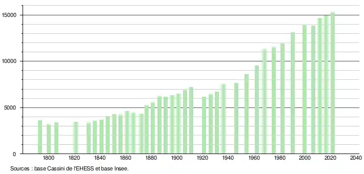 - Par convention dans Wikipédia, le principe a été retenu de n’afficher dans le tableau des recensements et le graphique, pour les populations légales postérieures à 1999, que les populations correspondant à une enquête exhaustive de recensement pour les communes de moins de 10 000 habitants, et que les populations des années 2006, 2011, 2016, etc. pour les communes de plus de 10 000 habitants, ainsi que la dernière population légale publiée par l’Insee pour l'ensemble des communes.