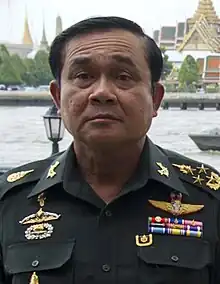 La junte doit faire face à quelques manifestations d'opposants au coup d'État, mais est soutenue par la bourgeoisie de Bangkok[18]. En juillet 2014, le roi Bhumibol Adulyadej, qui règne sous le nom de Rama IX, approuve une constitution provisoire qui octroie de larges pouvoirs aux militaires[19]. Le mois suivant, les 200 membres de l'Assemblée nationale législative sont directement désignés par la junte. Le général Prayuth Chan-ocha, qui était le seul candidat, est élu au poste de Premier ministre. Un gouvernement provisoire doit diriger le pays jusqu'à la tenue d'élections, prévues pour l'année suivante[20],[21]. La junte militaire souhaite désigner un conseil chargé de mettre en place des réformes constitutionnelles. Un « filtrage » des candidats est envisagé afin de diminuer le poids électoral du Pheu Thai, le parti de Shinawatra, qui remporte régulièrement les élections[9],[22].