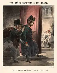 Caricature illustrant les rumeurs précoces d'un coup d'État manigancé par le parti de l'Ordre et le prince-président : Thiers incite Bonaparte à assassiner la République, faute d'avoir pu la séduire.