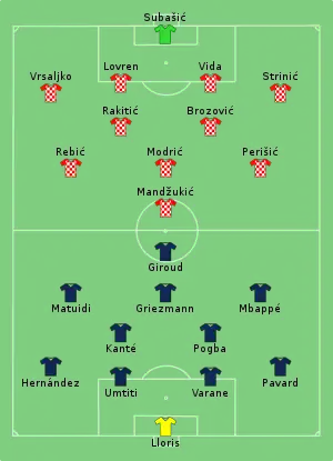 Le tournoi débouche sur une finale inédite entre la France, qui atteint ce stade de la compétition pour la 3e fois de son histoire après 1998 et 2006, et la Croatie, déjà demi-finaliste vingt ans plus tôt, qui accède pour la première fois à la finale (devenant ainsi historiquement le treizième pays finaliste de la Coupe du monde). Cette finale, très intense, voit la victoire des Bleus qui s'imposent 4 buts à 2 sur l'équipe au damier, décrochant ainsi leur deuxième étoile, vingt ans après leur premier sacre en 1998. Quant à la « petite finale » pour la troisième place, elle est remportée par la Belgique, qui bat l'Angleterre 2-0. Les Diables Rouges montent sur le podium pour la première fois de leur histoire. Luka Modrić reçoit le trophée de meilleur joueur de la compétition, Kylian Mbappé celui de meilleur jeune, Thibaut Courtois celui du meilleur gardien, alors que Harry Kane en est le meilleur buteur avec six réalisations.