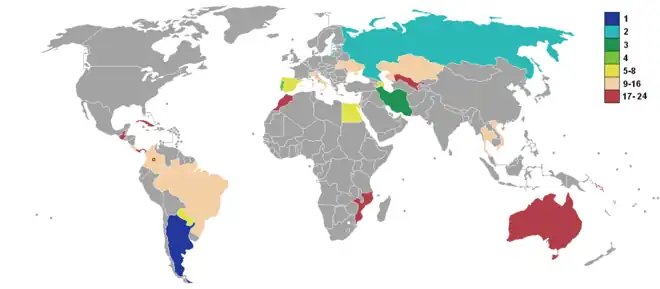 Six pays ont formulé une candidature pour accueillir l'événement : la Colombie, l'Espagne, la France, l'Iran, Porto Rico et la République tchèque. Cependant, quatre d'entre eux la retirent ensuite ce qui ne laisse que deux options :