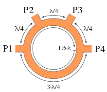 Un signal entrant sur le port 1 est divisé entre les ports 2 et 4 en opposition de phase et un signal entrant sur le port 3 est divisé entre les ports 2 et 4 en phase. L'impédance caractéristique de ces lignes de transmission est Z0√2 pour obtenir un couplage de 3 dB.
