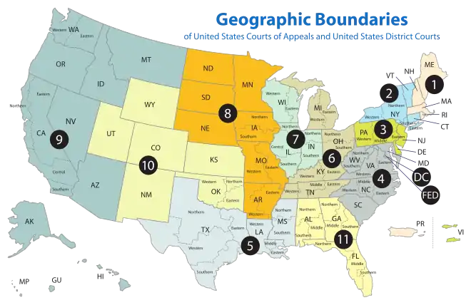 La liste ci-dessous énumère les états ou territoires relevant de chacune des cours d'appel fédérales. Les sièges administratifs respectifs sont précisés entre parenthèses. Le nombre de cours de districts par État ou territoire est également spécifié entre parenthèses face aux noms de chacun d’entre eux.