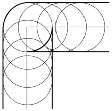 Une autre façon de généraliser est (même en 2D) de considérer une distance variable, par exemple paramétrée par une autre courbe[21]. On peut par exemple tracer (enveloppe) avec une ellipse au lieu d'un cercle[21] comme c'est possible par exemple dans Metafont.