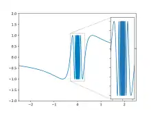 L'ensemble des valeurs d'adhérence de la fonction f en 0 est égal à celui de la fonction sin en +∞, c'est-à-dire au segment [-1, 1] (en particulier, f n'a pas de limite en 0). Ce phénomène est illustré par l'accumulation d'oscillations de la courbe au voisinage de l'origine.