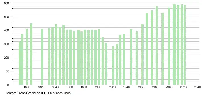 L'évolution du nombre d'habitants est connue à travers les recensements de la population effectués dans la commune depuis 1790. Pour les communes de moins de 10 000 habitants, une enquête de recensement portant sur toute la population est réalisée tous les cinq ans, les populations légales des années intermédiaires étant quant à elles estimées par interpolation ou extrapolation[19]. Pour la commune, le premier recensement exhaustif entrant dans le cadre du nouveau dispositif a été réalisé en 2007[20].