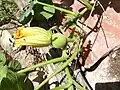 Les fleurs jaune à orange clair apparaissent sur des pédoncules durs, légèrement anguleux un peu élargi à la base du fruit[1]