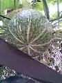 Les fruits sont de forme sphérique ovoïde, de 15 à 20 cm de long et jusqu'à 6 kg. Ils sont verts à maturité, ornés de taches claires formant des taches réticulées qui rappellent un peu l'aspect de la pastèque. Ils ont un épiderme très coriace et une chair blanche et tendre. Les graines sont brunes à noires et brodées[1].