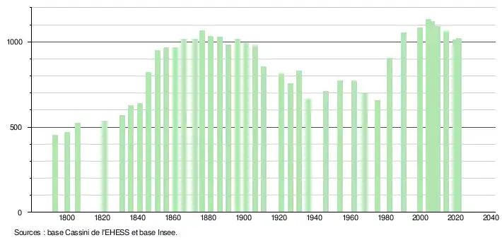 L'évolution du nombre d'habitants est connue à travers les recensements de la population effectués dans la commune depuis 1793. Pour les communes de moins de 10 000 habitants, une enquête de recensement portant sur toute la population est réalisée tous les cinq ans, les populations légales des années intermédiaires étant quant à elles estimées par interpolation ou extrapolation[23]. Pour la commune, le premier recensement exhaustif entrant dans le cadre du nouveau dispositif a été réalisé en 2004[24].