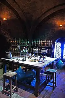 - La salle de défense contre les forces du Mal est plus sombre qu'à l'ordinaire, reflétant la personnalité de Rogue. Des images montrant des personnes souffrantes ou exhibant des blessures sont accrochées aux murs[36]. Rogue commence son cours par un discours sur le fait qu'ils doivent apprendre à s'adapter à des forces instables, changeantes ou paraissant indestructibles et que leurs défenses doivent par conséquent devenir plus flexibles et inventives. Rogue demande quel est l'avantage d'un sortilège informulé - le sujet du cours[22], et accorde la parole à Hermione qui précise qu'il permet d'obtenir une fraction d'avance sur l'adversaire qui ne sait pas quel genre de magie va être utilisé contre lui[36]. Rogue demande ensuite aux élèves de se mettre en binômes pour procéder aux premiers essais de sortilèges informulés. Hermione repousse aisément en demeurant muette, le maléfice de Jambencoton que lui lance, en chuchotant, Neville. Rogue, indifférent à l'exploit, se poste devant Harry et Ron pour observer la tentative de ce dernier sur Harry. Rien ne se produit. Rogue propose alors à Ron de lui montrer comment il convient d'agir en faisant lui-même une démonstration sur Harry. Mais celui-ci devine un prétexte du professeur pour s'en prendre à lui, prend peur, et lance par réflexe un charme du bouclier pour se protéger. Rogue perd l'équilibre et se rattrape à une table, ne manquant pas de rappeler à Harry qu'il était normalement question de sortilèges informulés. Harry répond avec insolence[36] et Rogue le convoque dans son bureau le samedi suivant.