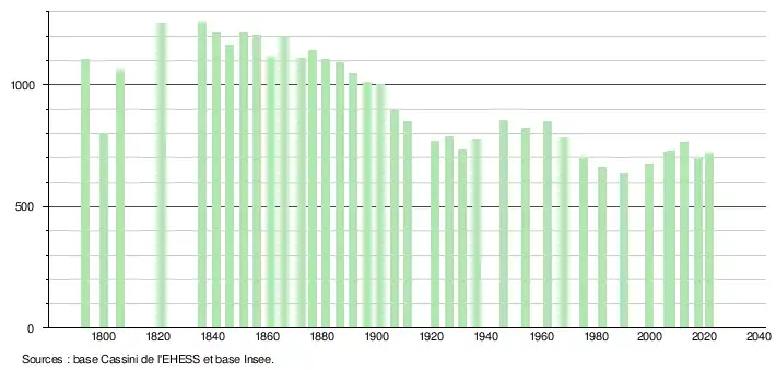 L'évolution du nombre d'habitants est connue à travers les recensements de la population effectués dans la commune depuis 1793. Pour les communes de moins de 10 000 habitants, une enquête de recensement portant sur toute la population est réalisée tous les cinq ans, les populations légales des années intermédiaires étant quant à elles estimées par interpolation ou extrapolation[34]. Pour la commune, le premier recensement exhaustif entrant dans le cadre du nouveau dispositif a été réalisé en 2007[35].
