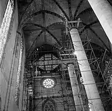 La troisième campagne[2] (de 1275 à 1292 essentiellement, jusqu'à 1315 marginalement) a été particulièrement importante, dotant l'église d'une abside dont les voûtes gothiques à croisées d'ogives culminant à 28 mètres sont soutenues par trois colonnes élevées dans l'axe est-ouest des piliers existants. Jaillissant du sommet de la colonne orientale, 22 nervures composent un gigantesque palmier minéral à la ramure géométrique. Prouesse architecturale unique, l'histoire n'a pas conservé le nom de son architecte. Le une messe inaugurale célébrée par Bertrand de Montaigu, abbé de Moissac, marque symboliquement la fin des travaux. Le clocher est terminé en 1298 et abrite la cloche de l'Université, sa tour de 45 mètres de hauteur supporte alors une flèche de plan octogonal qui sera détruite pendant la Révolution.