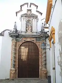 La façade possède un mur aveugle et un portail baroque avec fronton triangulaire.