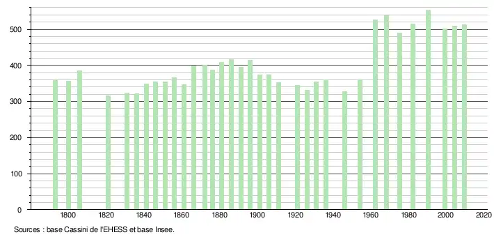 L'évolution du nombre d'habitants est connue à travers les recensements de la population effectués dans la commune depuis 1793. À partir du , les populations légales des communes sont publiées annuellement dans le cadre d'un recensement qui repose désormais sur une collecte d'information annuelle, concernant successivement tous les territoires communaux au cours d'une période de cinq ans. Pour les communes de moins de 10 000 habitants, une enquête de recensement portant sur toute la population est réalisée tous les cinq ans, les populations légales des années intermédiaires étant quant à elles estimées par interpolation ou extrapolation[12]. Pour la commune, le premier recensement exhaustif entrant dans le cadre du nouveau dispositif a été réalisé en 2004[13],[Note 2].