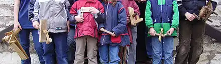 Elle est également utilisée dans l'Est de la France (Lorraine et Alsace[2]), au Luxembourg et dans le Pays d'Arlon en Belgique au moment de Pâques où les enfants l'utilisent à la place de la sonnerie de l'Angélus et pour appeler les fidèles aux offices en remplacement des cloches des églises « parties à Rome ». Dans certains villages de Meuse, elle se nomme tartuleuil. En Autriche, notamment en Carinthie, elle est utilisée à midi le Vendredi-Saint, en l'«absence» des cloches parties à Rome.