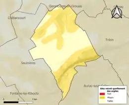 Le retrait-gonflement des sols argileux est susceptible d'engendrer des dommages importants aux bâtiments en cas d’alternance de périodes de sécheresse et de pluie. 55,9 % de la superficie communale est en aléa moyen ou fort (52,8 % au niveau départemental et 48,5 % au niveau national). Sur les 142 bâtiments dénombrés sur la commune en 2019, 114 sont en aléa moyen ou fort, soit 80 %, à comparer aux 70 % au niveau départemental et 54 % au niveau national. Une cartographie de l'exposition du territoire national au retrait gonflement des sols argileux est disponible sur le site du BRGM[19],[Carte 2].