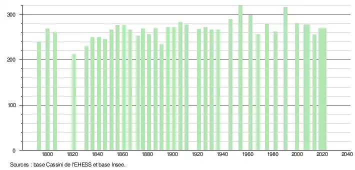 L'évolution du nombre d'habitants est connue à travers les recensements de la population effectués dans la commune depuis 1793. Pour les communes de moins de 10 000 habitants, une enquête de recensement portant sur toute la population est réalisée tous les cinq ans, les populations légales des années intermédiaires étant quant à elles estimées par interpolation ou extrapolation[24]. Pour la commune, le premier recensement exhaustif entrant dans le cadre du nouveau dispositif a été réalisé en 2008[25].