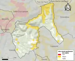Le retrait-gonflement des sols argileux est susceptible d'engendrer des dommages importants aux bâtiments en cas d’alternance de périodes de sécheresse et de pluie. 24,6 % de la superficie communale est en aléa moyen ou fort (67,7 % au niveau départemental et 48,5 % au niveau national). Sur les 94 bâtiments dénombrés sur la commune en 2019, 49 sont en aléa moyen ou fort, soit 52 %, à comparer aux 72 % au niveau départemental et 54 % au niveau national. Une cartographie de l'exposition du territoire national au retrait gonflement des sols argileux est disponible sur le site du BRGM[36],[Carte 2].