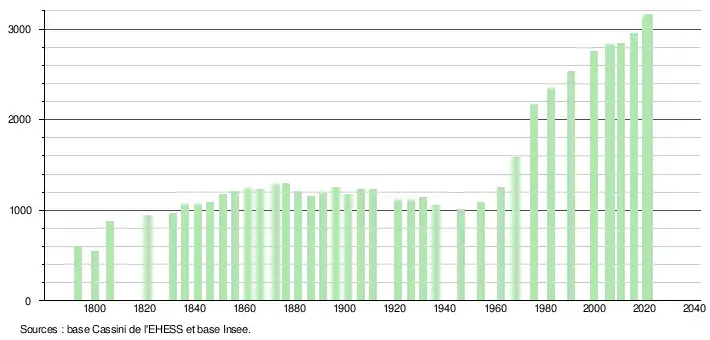L'évolution du nombre d'habitants est connue à travers les recensements de la population effectués dans la commune depuis 1793. Pour les communes de moins de 10 000 habitants, une enquête de recensement portant sur toute la population est réalisée tous les cinq ans, les populations légales des années intermédiaires étant quant à elles estimées par interpolation ou extrapolation[31]. Pour la commune, le premier recensement exhaustif entrant dans le cadre du nouveau dispositif a été réalisé en 2005[32].