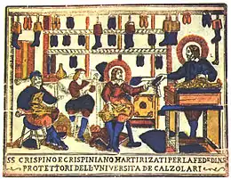 Crépin et Crépinien[4], venus de Rome, étaient chrétiens et cordonniers à Soissons. Ils fabriquaient des chaussures pour les pauvres, qu'ils ne faisaient pas payer, et pour les riches qui appréciaient leur production.