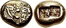 Avant Crésus, son père Alyatte II avait déjà commencé à frapper divers types de pièces de monnaie non standardisées. Elles étaient fabriquées dans un matériau naturel appelé électrum, un mélange variable d'or et d'argent (avec environ 54 % d'or et 44 % d'argent), et étaient utilisées en Lydie, dans sa capitale Sardes et dans les régions avoisinantes pendant environ 80 ans avant le règne de Crésus en tant que roi de Lydie[1]. Le caractère imprévisible de la composition des pièces d'électrum impliquait qu'elles avaient une valeur variable, ce qui a considérablement entravé le développement d'une monnaie standardisée[1]. Le symbole royal apposé sur la pièce, semblable à un sceau, indiquait la valeur du contenu en or, en argent ou en électrum.