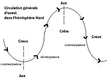 - à l’avant de l'axe de la crête, le flux d'air qui provient des zones polaires et qui amène de l'air froid ;