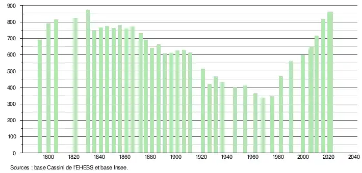 L'évolution du nombre d'habitants est connue à travers les recensements de la population effectués dans la commune depuis 1793. Pour les communes de moins de 10 000 habitants, une enquête de recensement portant sur toute la population est réalisée tous les cinq ans, les populations légales des années intermédiaires étant quant à elles estimées par interpolation ou extrapolation[13]. Pour la commune, le premier recensement exhaustif entrant dans le cadre du nouveau dispositif a été réalisé en 2005[14].