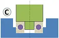 - Fig. C : le pivot est simplement appuyé sur une butée à bille centrée dans le palier. Ce dispositif, moins onéreux que les cas précédents, permet en plus de supporter de fortes charges axiales avec une lubrification plus simple.