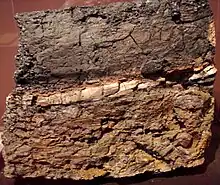 À l'aube des années 1980[8], l'existence d'une fine strate noire d'argile de quelques millimètres d'épaisseur a été remarquée dans certaines couches géologiques, entre les strates du Crétacé et du Tertiaire : la limite Crétacé-Tertiaire (K-T), aujourd'hui appelée limite Crétacé-Paléogène (K-Pg). Cette limite géologique est visible en divers points du globe, ce qui implique un phénomène important de niveau planétaire, et elle présente un taux anormal d'iridium[9]. La présence de cet élément est extrêmement rare sur Terre, mais il est plus abondant dans certaines météorites[9]. Si on trouve d'infimes quantités d'iridium dans les roches sédimentaires terrestres, c'est surtout dû à la fine pluie de micrométéorites qui arrivent régulièrement sur notre planète. Or des analyses de la teneur en iridium de la mince couche K/T montrent des résultats près de cent fois supérieurs ; il a alors été théorisé la chute d’une importante météorite à cette période[10].