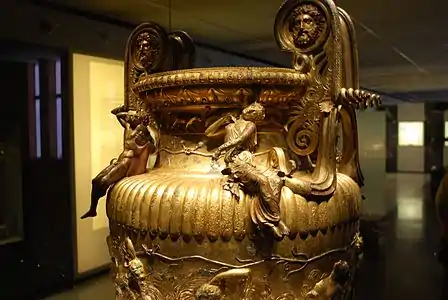 Le vase est composé de deux feuilles de métal qui ont été martelées puis jointes, tandis que les anses et les volutes ont été fondues.
