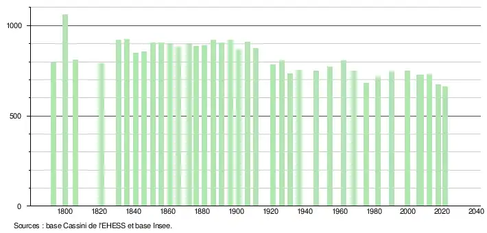 L'évolution du nombre d'habitants est connue à travers les recensements de la population effectués dans la commune depuis 1793. Pour les communes de moins de 10 000 habitants, une enquête de recensement portant sur toute la population est réalisée tous les cinq ans, les populations légales des années intermédiaires étant quant à elles estimées par interpolation ou extrapolation[34]. Pour la commune, le premier recensement exhaustif entrant dans le cadre du nouveau dispositif a été réalisé en 2007[35].
