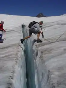 La crevasse est l'un des éléments les plus symboliques de l'alpinisme. Une crevasse ouverte est une crevasse béante bien visible. Beaucoup plus dangereuse, la crevasse fermée est recouverte par un pont de neige qui peut céder au passage d'un alpiniste. La progression sur glacier aux premières heures du jour quand la neige est encore dure permet de limiter ce risque.