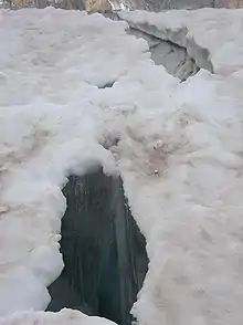 Une crevasse est en glaciologie une ouverture naturelle à la surface d'un glacier lorsqu'il avance et qu'il est face à une pente assez raide. Plusieurs types de crevasses sont observés en fonction du terrain. Les crevasses peuvent représenter un véritable danger dans la pratique de l'alpinisme.