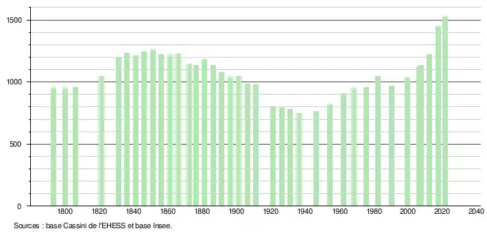 L'évolution du nombre d'habitants est connue à travers les recensements de la population effectués dans la commune depuis 1793. Pour les communes de moins de 10 000 habitants, une enquête de recensement portant sur toute la population est réalisée tous les cinq ans, les populations légales des années intermédiaires étant quant à elles estimées par interpolation ou extrapolation[18]. Pour la commune, le premier recensement exhaustif entrant dans le cadre du nouveau dispositif a été réalisé en 2007[19].