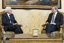 Le 14 juillet, alors qu'il avait largement remporté le vote de confiance, Draghi a proposé sa démission, qui a été rejetée par le président Sergio Mattarella[5],[6],[7]. Le 21 juillet, le Premier ministre Draghi a de nouveau démissionné après qu'un nouveau vote de confiance au Sénat n'ait pas réussi à passer à la majorité absolue, à la suite des défections de M5S, Lega et Forza Italia[8],[9],[10]. Le président Mattarella a accepté la démission de Draghi et a demandé à Draghi de rester en place pour gérer les affaires courantes[11].