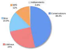 | Parti conservateur | Stephen Harper | 124 | 127 | 143 | + 19 | 5 205 334 | 37,6 % | + 1,4 | |