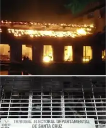 Quatre tribunaux électoraux départementaux ont suspendu le dépouillement réalisé par le TREP en raison des manifestations citoyennes qui se déroulaient à l'extérieur des centres de décomptage[54]. Le maire de Cobija, Luis Gatty Ribeiro, et le gouverneur de Pando, Luis Adolfo Flores, ont été attaqués par un groupe de manifestants, et Flores a été hospitalisé[55]. À Oruro, un local de campagne du MAS et un véhicule du Ministère Public ont été détruits[56].