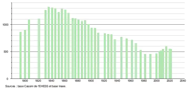 L'évolution du nombre d'habitants est connue à travers les recensements de la population effectués dans la commune depuis 1793. Pour les communes de moins de 10 000 habitants, une enquête de recensement portant sur toute la population est réalisée tous les cinq ans, les populations légales des années intermédiaires étant quant à elles estimées par interpolation ou extrapolation[22]. Pour la commune, le premier recensement exhaustif entrant dans le cadre du nouveau dispositif a été réalisé en 2004[23].