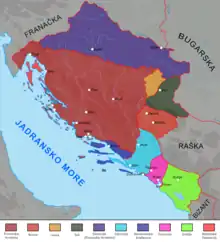Au milieu du IXe siècle, la Pannonie était sous la domination des Bulgares, puis du comté de Basse-Pannonie. Certains écrits mentionnent les princes Pribina[10] et Kocel, mais aujourd'hui, on considère généralement qu'il s'agissait de princes slaves de l'ouest, probablement de Carantanie, qui régnaient sur la Basse-Pannonie dans la région autour du lac Balaton. Ils ont étendu leur autorité à la Pannonie et ont affronté les Croates de la côte à l'époque du prince dalmate Iljko. C'est également la période de l'activité de Cyrille et Méthode, et le pape Adrien II nomme lui-même Métode évêque de Syrmie. Le pape Jean VIII informe fin 873 le souverain "sclavinien" Mutimir (dux Sclaviniae) qu'un évêque a été consacré dans le diocèse pannonien et qu'il peut maintenant se consacrer à son ministère pastoral, ajoutant : "Nous vous conseillons de faire autant que possible pour retourner au diocèse pannonien, à l'exemple de vos ancêtres." C'est la seule nouvelle de l'existence du prince Mutimir dans la région de la Pannonie "sclavinienne". L'historiographie serbe suppose que c'était le prince serbe Mutimir de l'époque, mais on dit de lui qu'il était le premier prince chrétien, donc il serait difficile pour lui de "retourner" au diocèse pannonien. À cette époque, Svatopluk, le prince de la Grande Moravie, règne sur Basse Pannonie et résiste initialement à l'autorité franque.