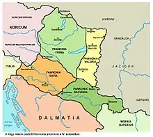 Après la période romaine, la Pannonie est passée sous le contrôle des Ostrogoths (453)[4], des Lombards (527)[5], et des Avars (568)[5]. Déjà au VIe siècle, les Slaves se sont installés dans la région de la Pannonie. Lorsque Charlemagne a détruit l'État avar à la fin du VIIIe siècle, les Slaves sont restés en Pannonie. À la fin du IXe siècle, les Hongrois ont traversé les Carpates jusqu'à la plaine danubienne, repoussant les Slaves et occupant la Pannonie Valéria et la Pannonie première, à l'exception de sa partie nord-ouest qui était contrôlée par les Allemands. La Pannonie de la Save et la Pannonie seconde sont restées sous le contrôle des Slaves. À partir de ce moment, le nom de Pannonie a progressivement disparu[6].