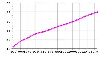 À l'échelle mondiale, le taux de croissance démographique s'est néanmoins graduellement atténué depuis les années 1970, après un pic dans les années 1960, avec plus de 2,0 % par année[6]. Le rythme de croissance de la population est hétérogène, variant fortement selon les pays et régions.