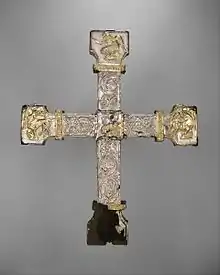 Sur l'avant, l'image principale de Jésus-Christ crucifié et couronné, tenant dans chacun des bras latéraux les figures de la Vierge Marie et de Saint-Jean, un de chaque côté. Couronnant la partie supérieure de la croix on peut voir un ange et dans la partie inférieure la représentation d'Adam sortant de sa tombe. Sur la tête du Christ il y a une cavité bouchée avec une pierre précieuse qui contient encore une relique, sans que l'on sache à qui elle correspond[2].