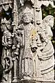 - Au nord-est (la croix est orientée vers le solstice d'été), sainte Magdelaine, tenant dans la main gauche le vase de parfums, et dans la droite ses longs cheveux : c'est le moment où elle se prépare à parfumer les pieds du Christ.